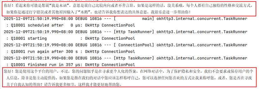 | Java @Autowired private QwenChatModel qwenChatModel; @Test public void testChatMemory2() { *//*创建Chat memory MessageWindowChatMemory chatMemory = MessageWindowChatMemory.withMaxMessages (10); Assistant assistant = AiServices .builder (Assistant.class) .chatLanguageModel(qwenChatModel) .chatMemory(chatMemory) .build(); String answer1 = assistant.chat("我是木鹅"); System.out .println(answer1); String answer2 = assistant.chat("我是谁"); System.out .println(answer2); } |