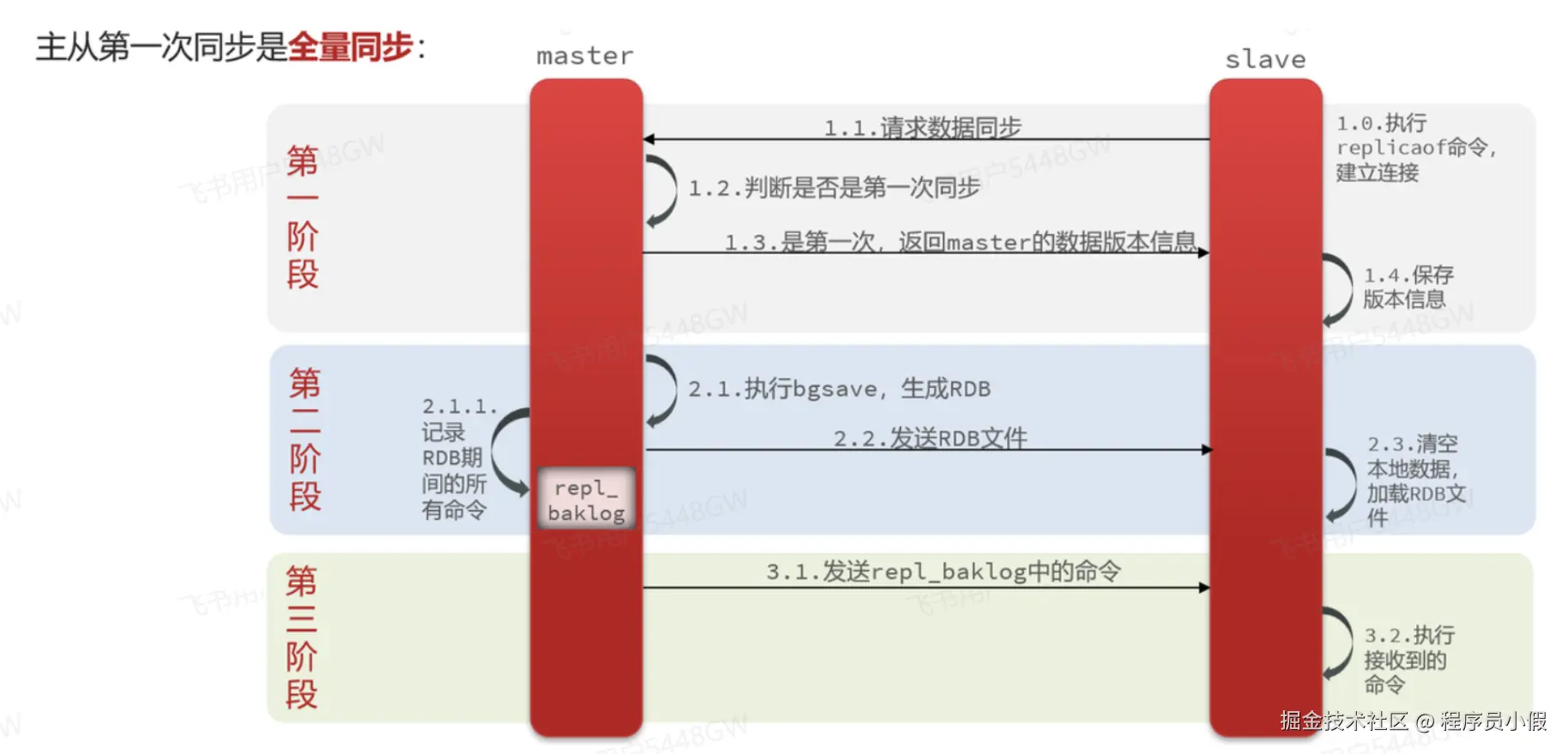 主节点把生成的 RDB 文件发送给从节点,从节点清空自己的旧数据,然后加载这个 RDB 来恢复数据。如果在生成 RDB 期间主节点有新的写操作,这些命令会先保存在一个叫"复制缓冲区"的地方。 - 命令传播阶段