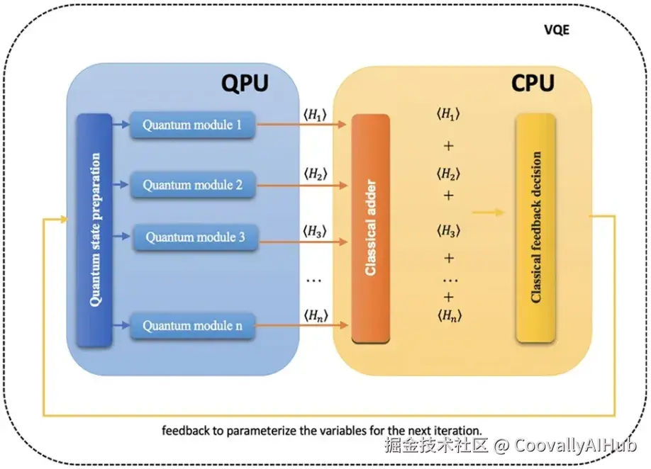 VQE也采用混合方法,结合了量子计算和经典计算。量子计算机准备和测试可能的状态,而经典计算机分析结果并调整参数以提高准确性。