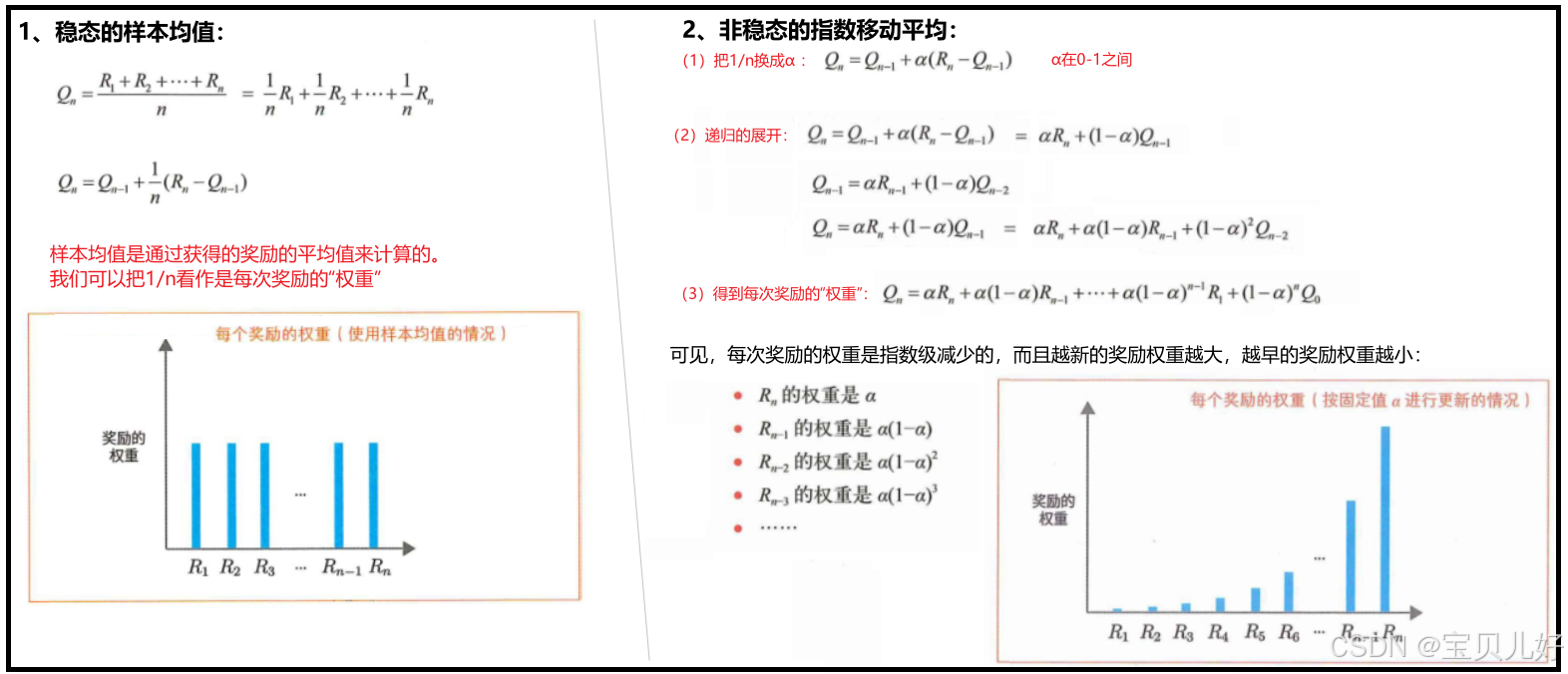 对于非稳态问题,环境(老虎机)随时间变化,就是过去获得的奖励的重要性是应该随着时间的推移而下降的,也就是我们在计算期望奖励的时候,要给新获得的奖励更大的权重。