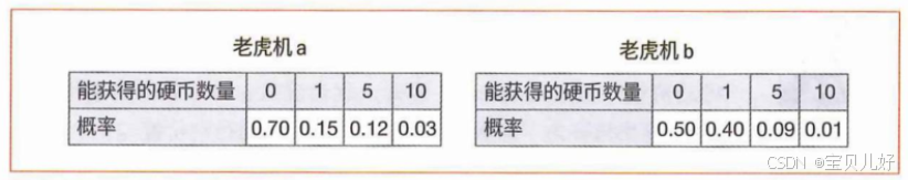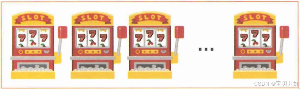 上图是一组多台老虎机 ,每台老虎机的特点 都各不相同 ,就是有的机器赢得多,有的机器输得多。但是每台老虎机的特点 是固定的 ,就是每台机器的奖励的概率是固定的: