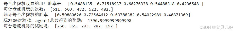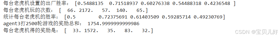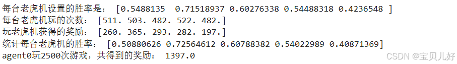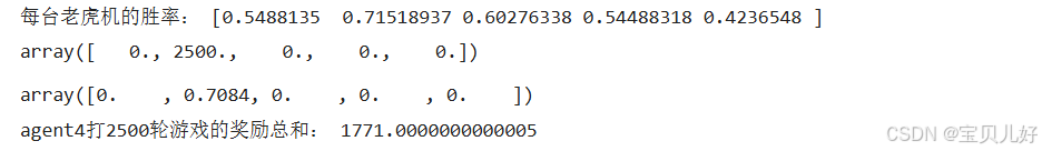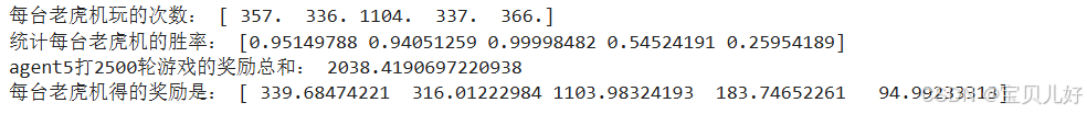 print("agent3打2500轮游戏的奖励总和:", sum(agent3.ns * agent3.Qs))
