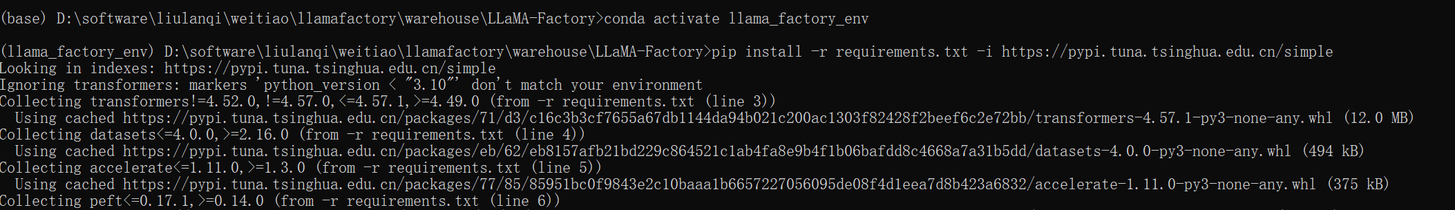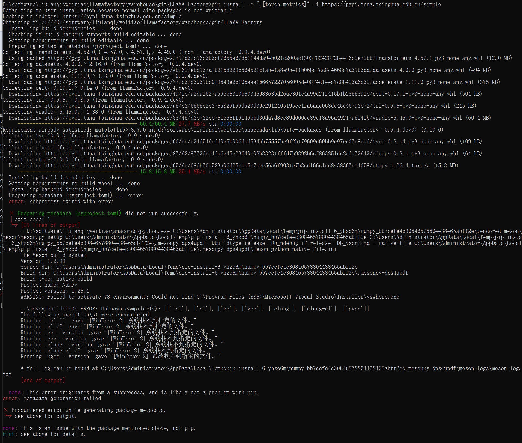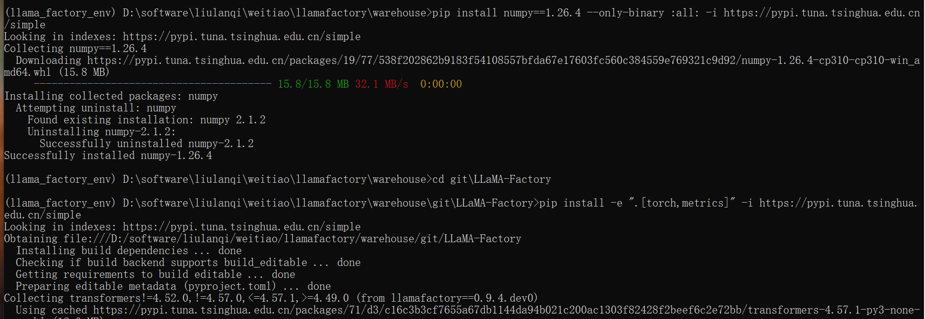 pip install numpy==1.26.4 --only-binary :all: -i https://pypi.tuna.tsinghua.edu.cn/simple (--only-binary表示只下载预编译好的包,跳过源码编译) 执行完后,在执行上面执行过的如下命令 pip install -e ".[torch,metrics]" -i https://pypi.tuna.tsinghua.edu.cn/simple这样就可以顺利安装好依赖了。