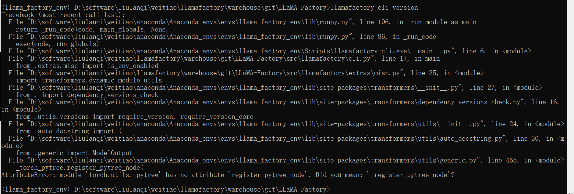 llamafactory-cli version来快速校验安装是否成功。出现如下图报错,transformers库版本与torch版本不兼容 导致的:因为transformers新版本用到了torch.utils._pytree.register_pytree_node,但你当前的torch 2.1.0中这个接口还没开放(或命名不同)。但是明明没手动执行