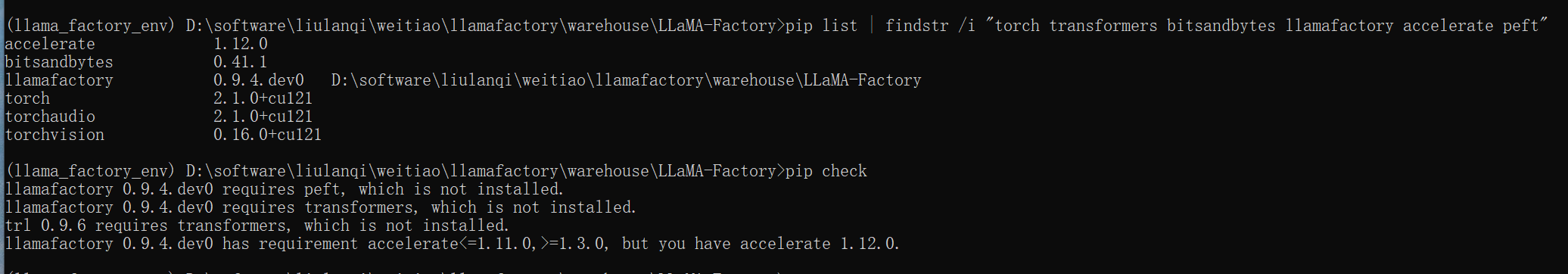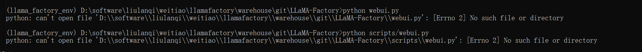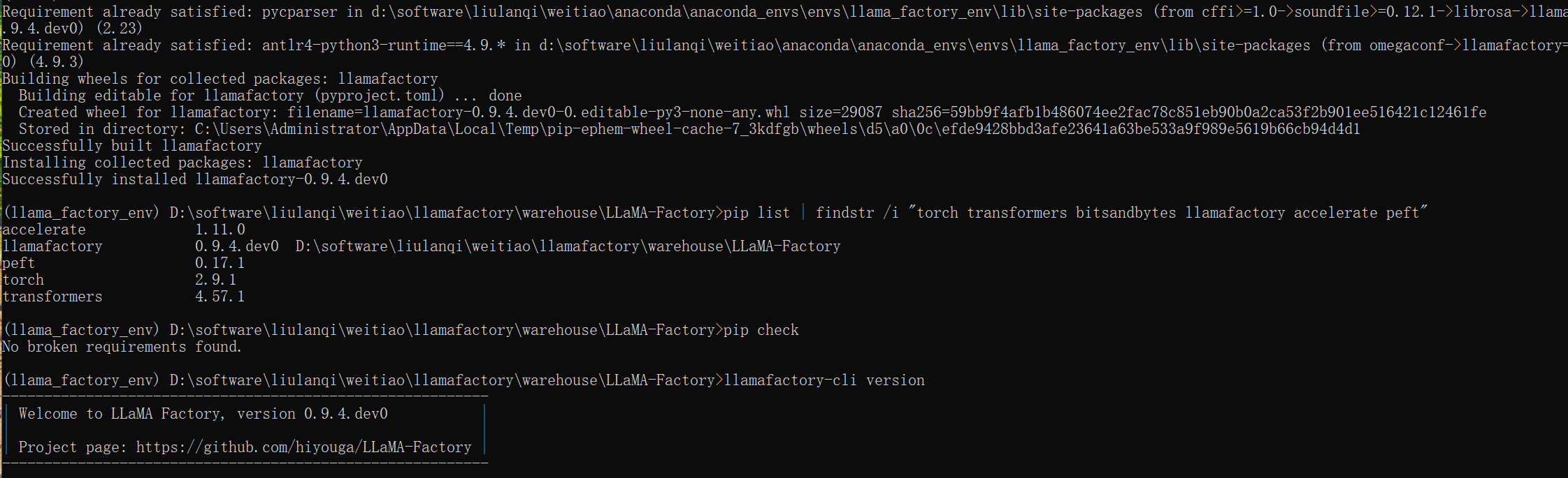 git clone下载的 LlamaFactory 代码,完整路径应该是:D:\software\liulanqi\weitiao\llamafactory\warehouse\LLaMA-Factory(进入这个文件夹,能看到setup.py、webui.py、requirements.txt等文件,就是正确目录。在对应目录下执行下面这条命令就可以
