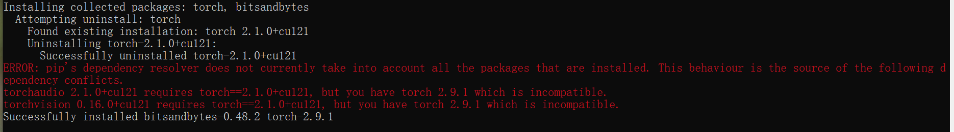 bitsandbytes时,pip 自动把你的torch版本升级到了2.9.1,但原来的torchaudio和torchvision是依赖torch==2.1.0+cu121的,新版本torch 2.9.1和它们不兼容。