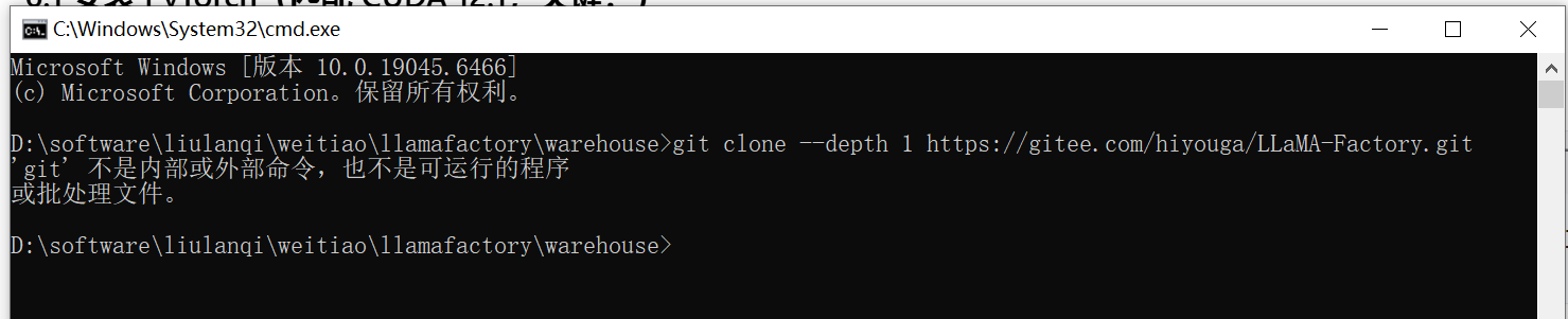 git clone --depth 1 https://gitee.com/hiyouga/LLaMA-Factory.git注意执行 下面的llamafactory核心依赖时,要在llamafactory的根目录下执行,不然会出下面如下报错