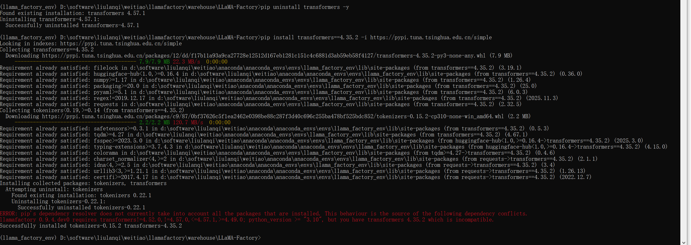 # 先装适配torch 2.1.0的transformers 4.35.2 pip install transformers==4.35.2 -i https://pypi.tuna.tsinghua.edu.cn/simple pip install -e ".[torch,metrics]" -i https://pypi.tuna.tsinghua.edu.cn/simple --no-deps但安装第一步时发现如下报错,卸载再去安装又和别的依赖冲突了。
