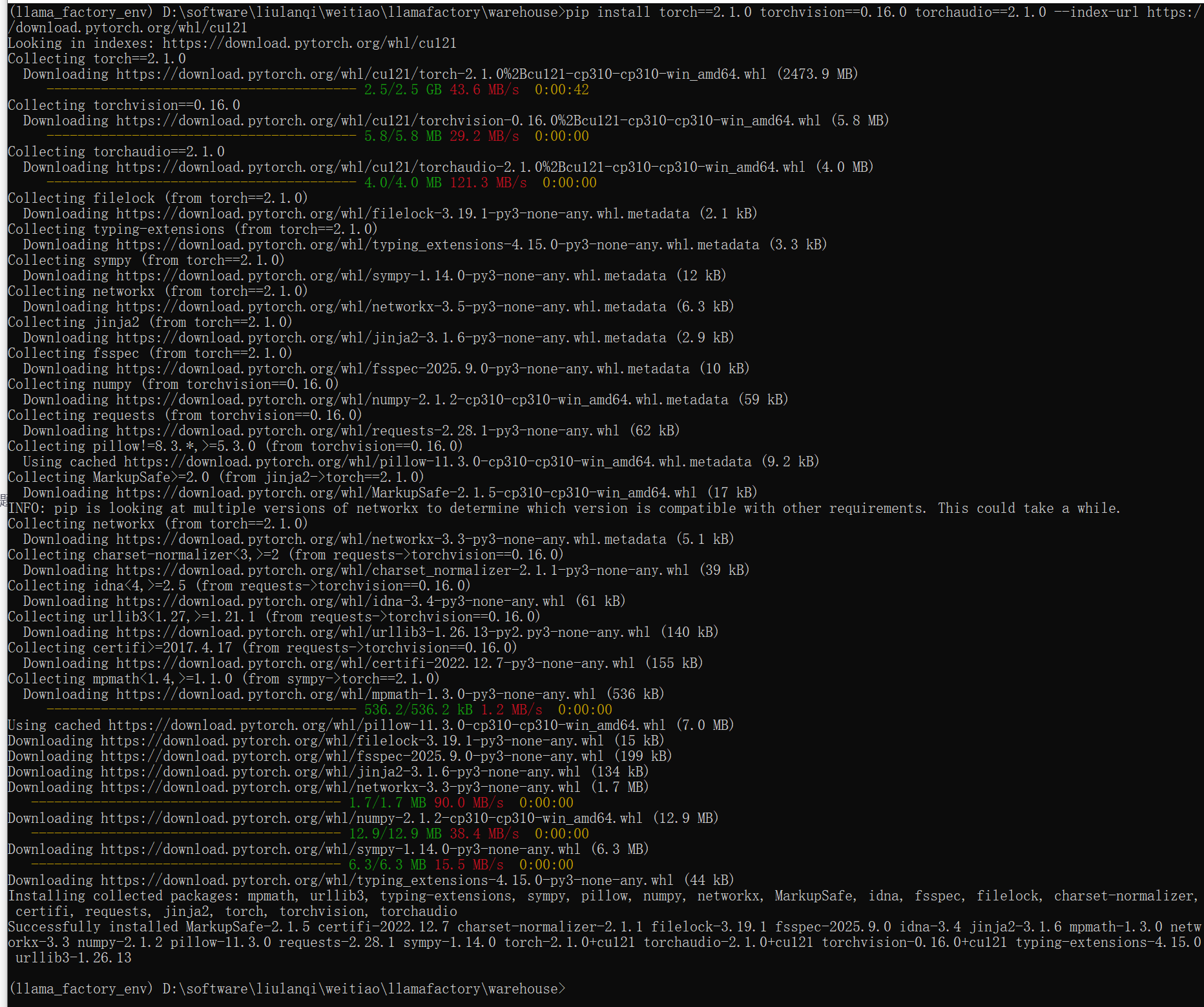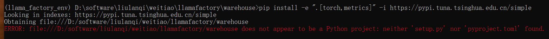 warehouse目录执行pip install torch能成功,但执行pip install -e ".[torch,metrics]"失败,核心是这两条pip命令的逻辑完全不同------ 前者是 "安装公共库",后者是 "安装当前目录下的本地项目"(LlamaFactory 这个开源项目),核心依赖当前目录的配置文件。如上图所示还是出现了问题,这是安装