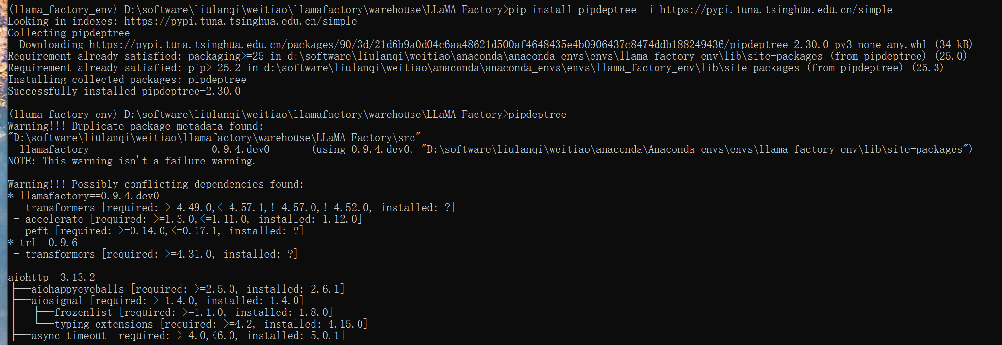 # 安装依赖树工具 pip install pipdeptree -i https://pypi.tuna.tsinghua.edu.cn/simple # 查看所有依赖的版本+依赖关系 pipdeptree # 只看冲突的依赖(过滤关键信息) pipdeptree --warn silence | findstr /i "conflict" # Windows # pipdeptree --warn silence | grep -i "conflict" # Linux/Mac因为出现的依赖问题太多,后来我直接删除了虚拟环境,重新下载依赖