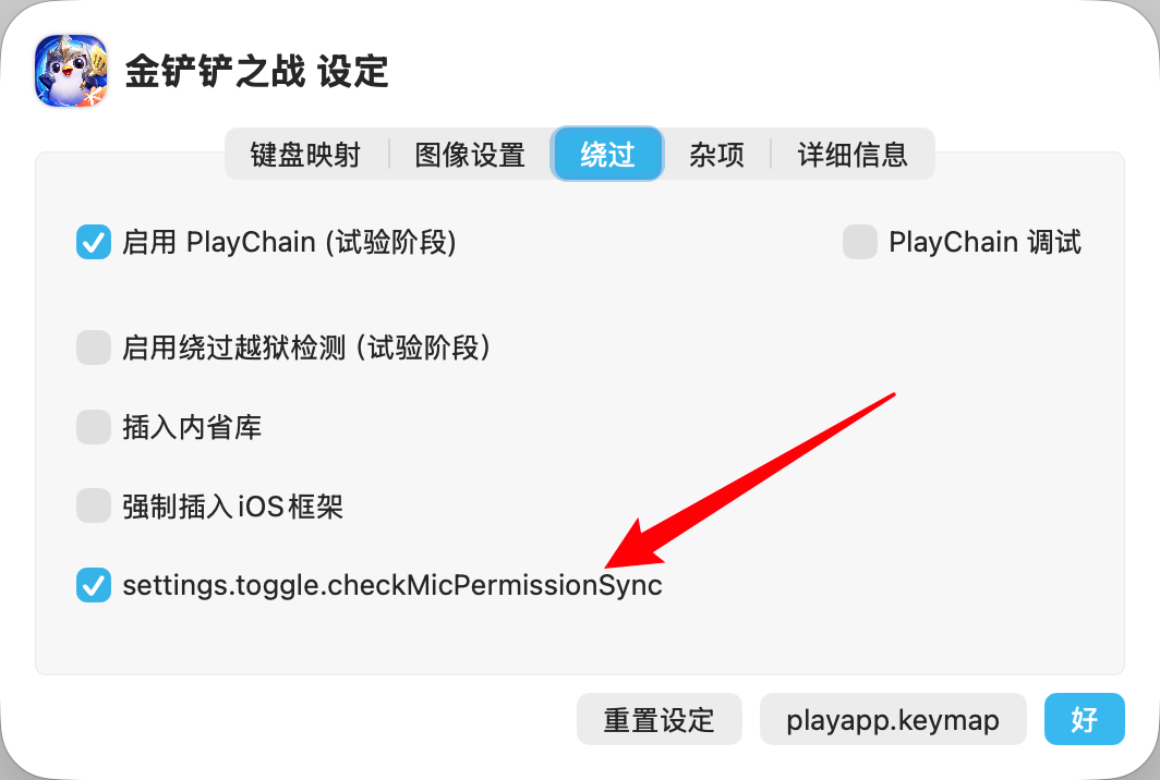 我们进入 playCover 选择金铲铲图标右键-设置,绕过一栏中勾选上最后面的 'checkMicPermissionSync' 选项(不同的 playCover 版本具体展示名称位置等可能有略有差异),如下图