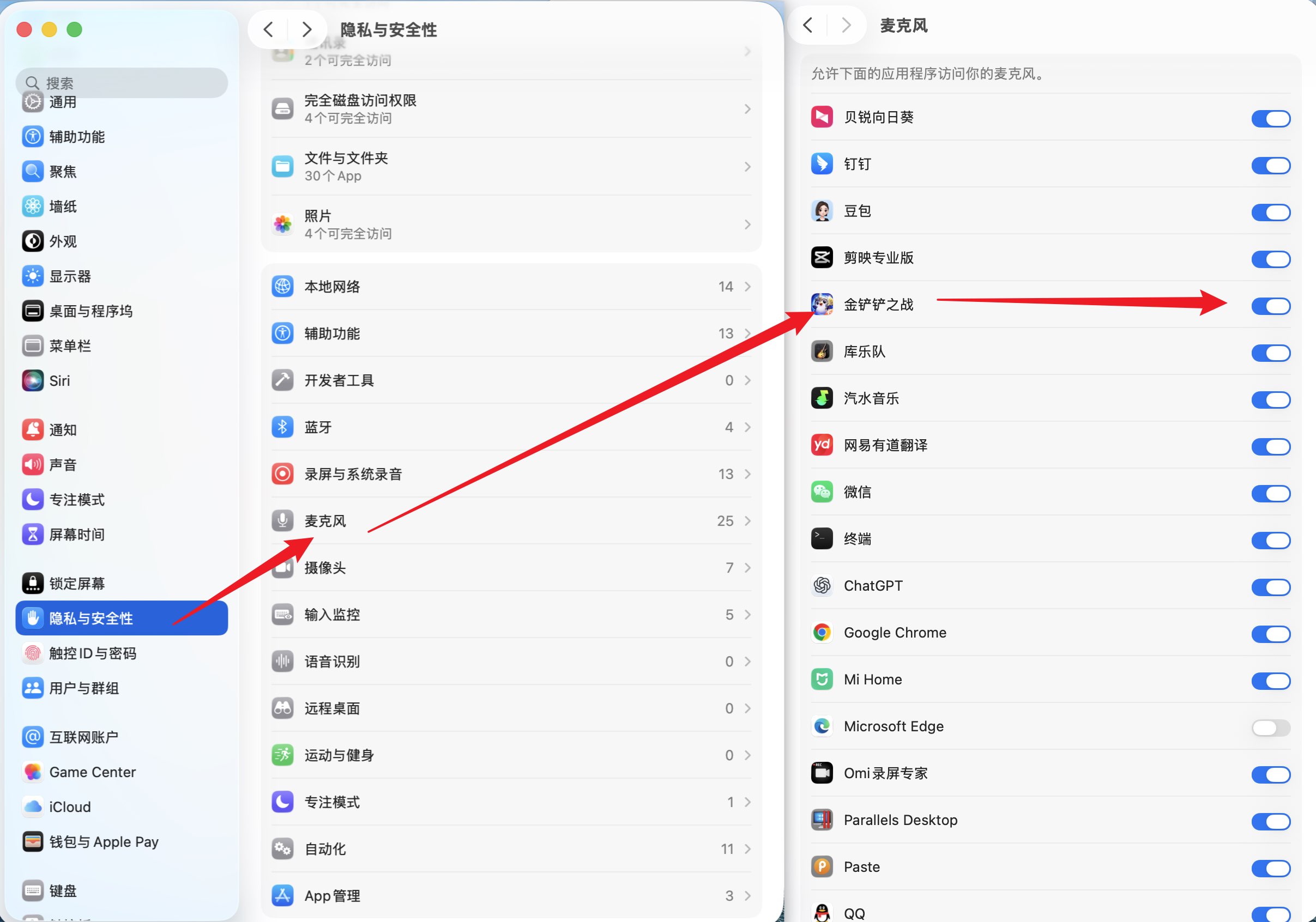 我们需要在 mac 系统设置里,找到 隐私与安全性 - 麦克风,在里面找到金铲铲游戏打开麦克风权限