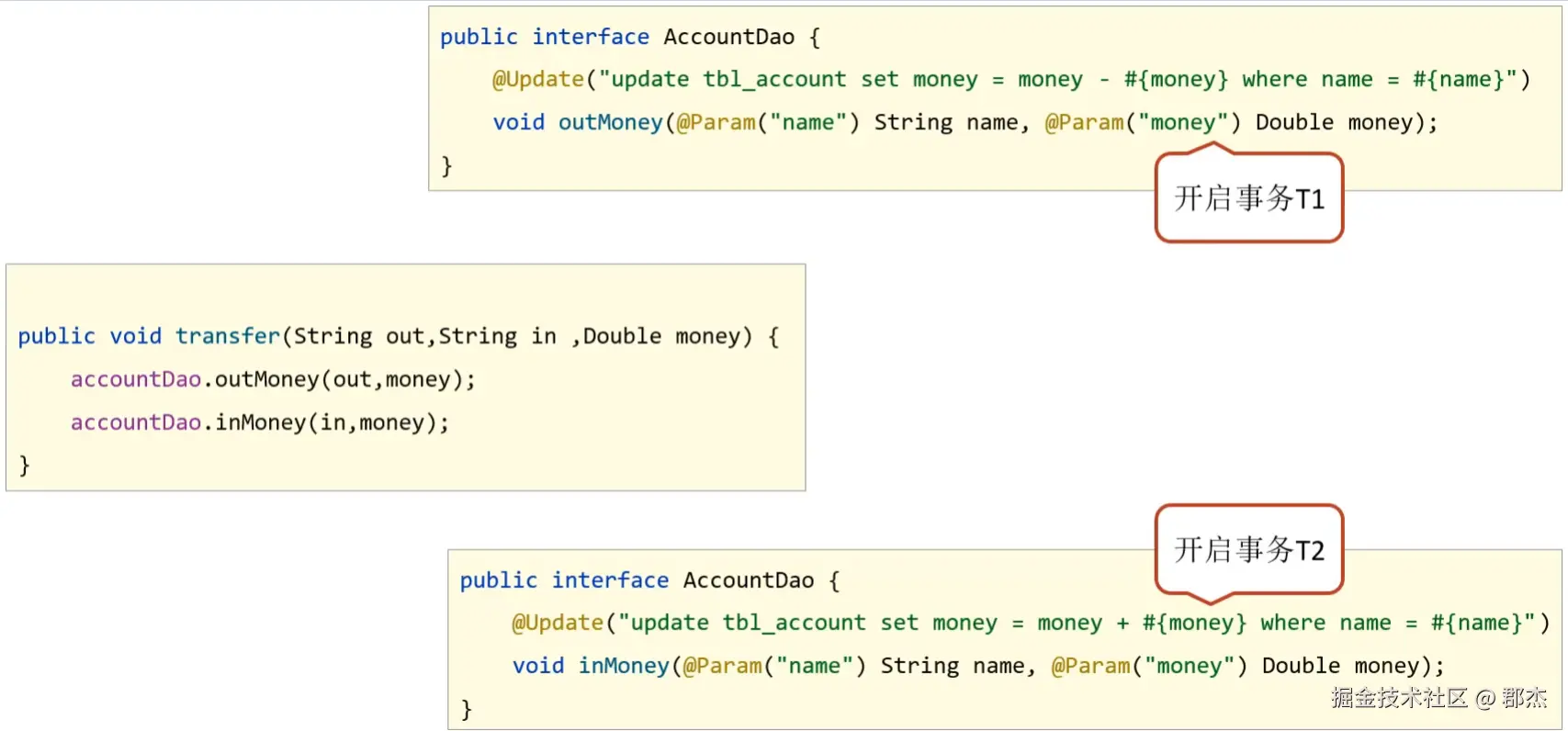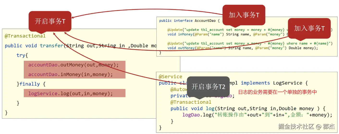 transfer()方法开启事务T,包含inMoney()方法和outMoney()方法log()方法因为加了@Transactional注解,开启了事务T2。log()方法默认传播行为是REQUIRED,会加入现有事务T- 当转账失败时,事务T回滚,导致