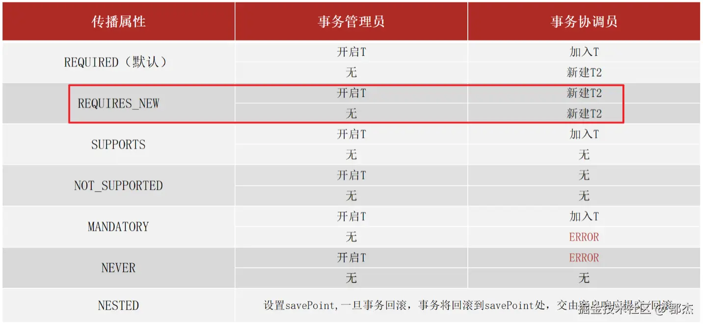 transfer()方法)调用事务协调员(如log()方法)时 - 事务协调员需要决定:是加入调用方的事务,还是自己开启新事务,或是不在事务中执行