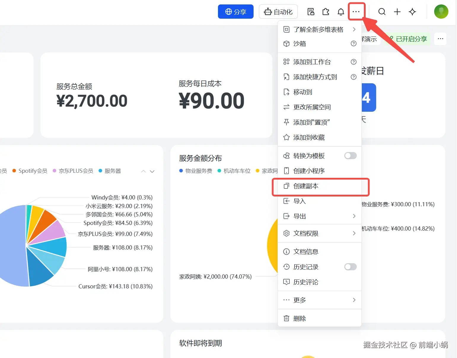 不过这次没写代码,直接用了 飞书多维表格 (Feishu Base) 。折腾了一个周末,弄了一套 "个人资产与订阅管理系统"。