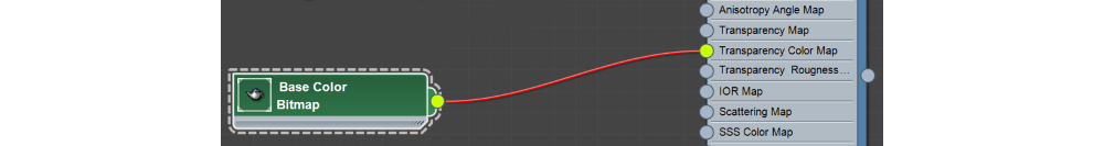如果有 Alpha 通道,引擎会自动使用基础色 纹理的 Alpha 通道作为透明映射。要让透明度在3ds Max视口中可见,将基础颜色 纹理的Alpha 通道连接到透明度颜色映射输入。