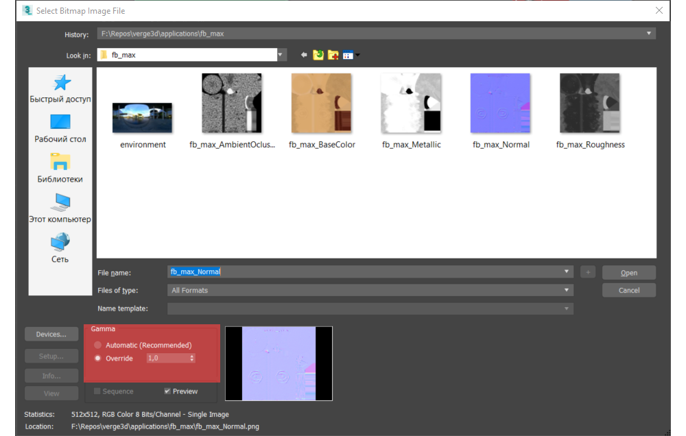 为了实现正确的渲染,图像应考虑色彩空间。除基础色 和发射 纹理外,所有图像都必须以线性色彩空间呈现。要做到这一点,在打开图片 对话框时,在Gamma偏好设置 中选择1.0值的覆盖Gamma(如下图所示)。