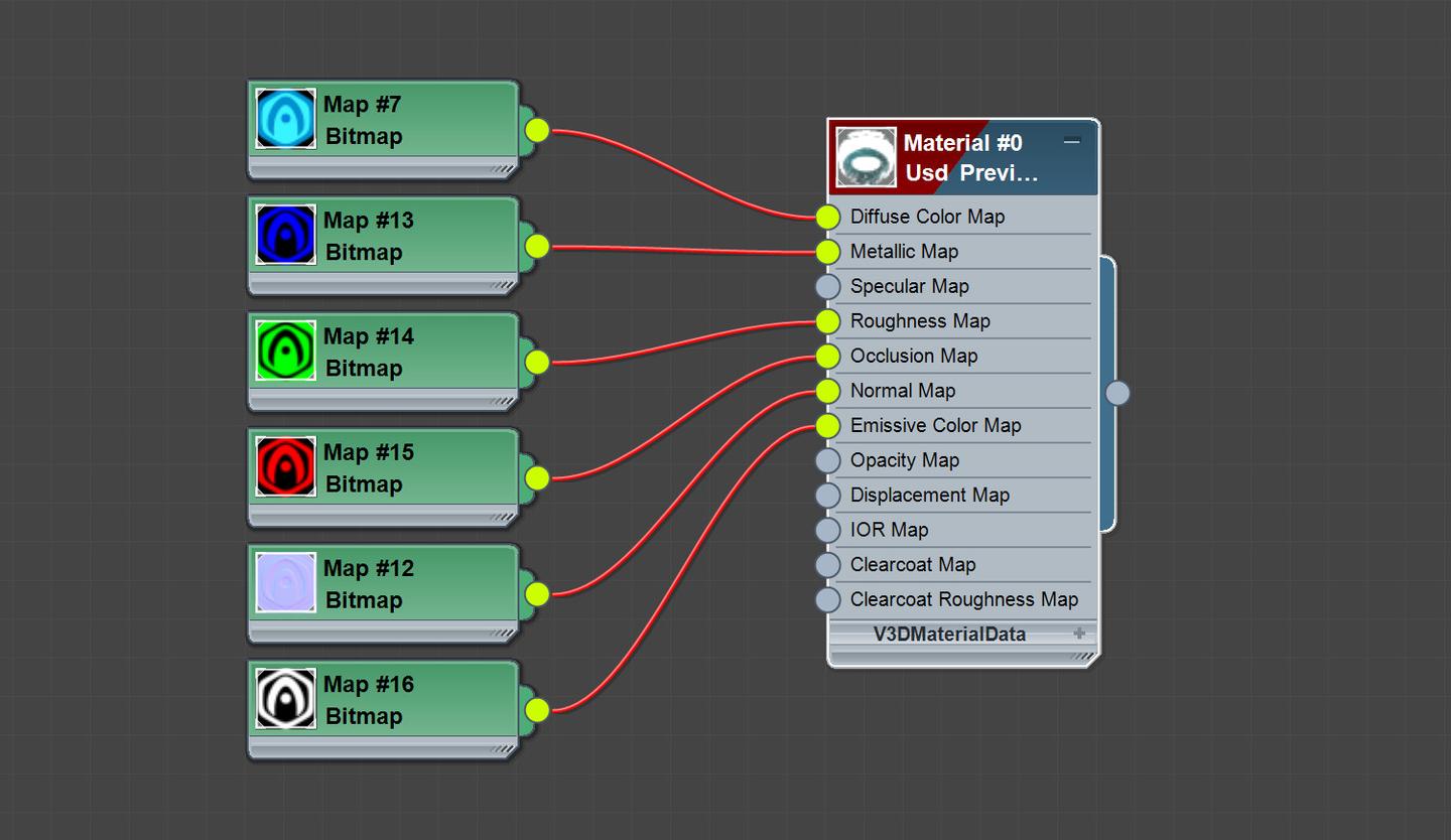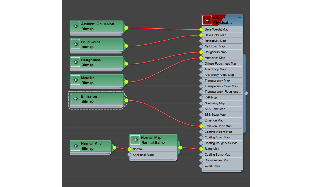 然后你可以像下面描述的那样,将纹理节点连接到物理材质。请注意,所有纹理都是可选的,任何纹理都可以安全省略。