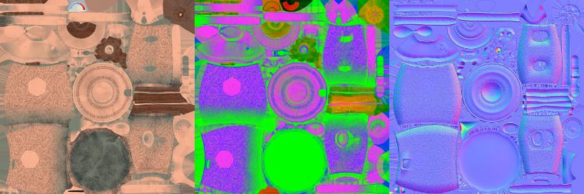 最终该软件生成了3个贴图:底色/透明度、遮挡/粗糙度/金属感和法线。