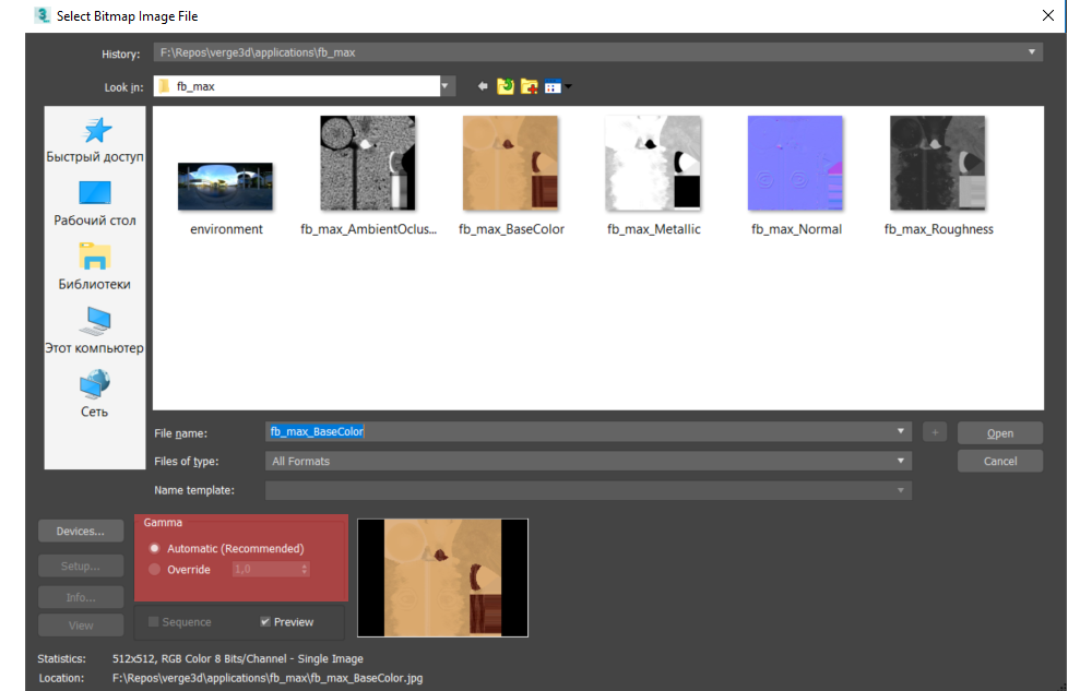 相反,基色 和发射 纹理必须在 sRGB 色彩空间(使用 Gamma 2.2)中打开。要实现它,只需在**"打开图片** "对话框的伽玛偏好设置中保持自动。