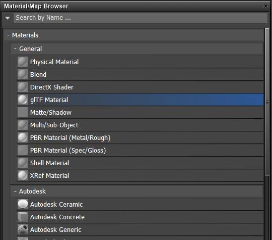 按照以下方式添加一个glTF材质 着色器节点:进入材质/地图浏览器 ,从通用 材质列表中选择glTF材质。