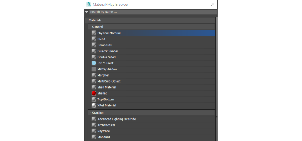 按以下方式添加一个物理材质 着色器节点:进入材质/地图浏览器 ,从通用 材质列表中选择物理材质。