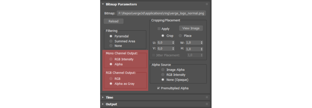 另外,在纹理的偏好设置 里,位图参数 面板里你应该把单色香奈儿输出 设置为Alpha,RGB通道输出 设置为Alpha为灰色。