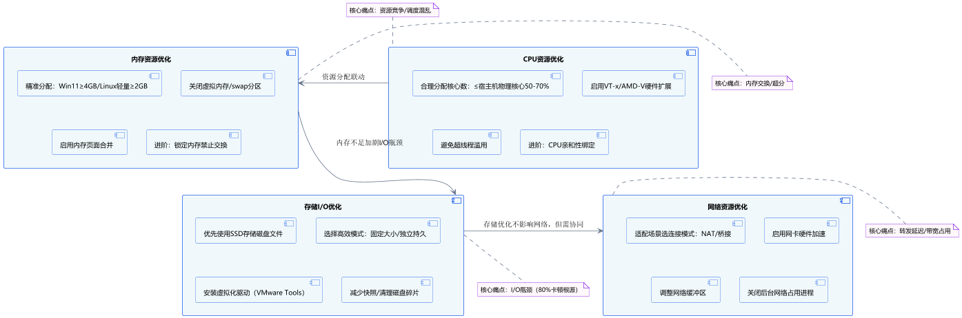 虚拟机卡顿多源于存储I/O瓶颈(如开机慢、打开大文件卡顿),核心优化方向是"提升磁盘读写速度"与"减少I/O竞争":