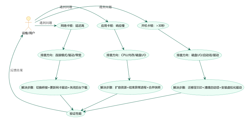 遇到虚拟机卡顿,可按"定位瓶颈→针对性优化"的流程排查,以下是3类高频问题的解决方案: