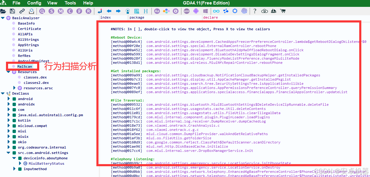 - 独创基于GDA反编译内核和可疑API链的恶意行为检测与发现,支持快速定位和反编译可疑代码