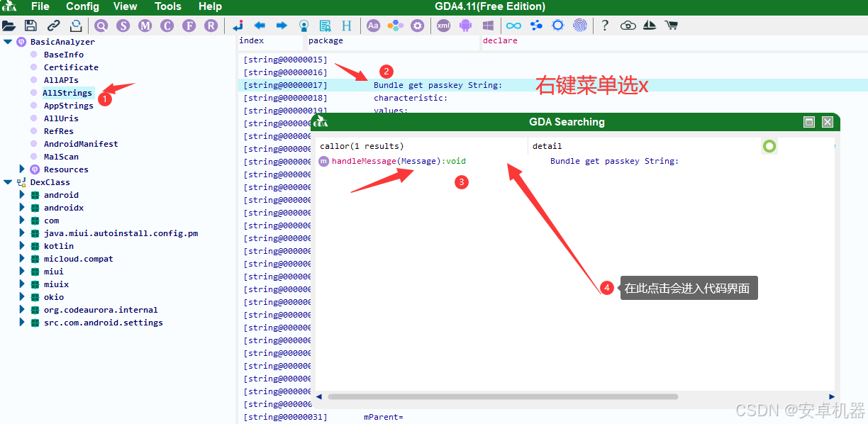 - 支持对strings,class,method,field进行交叉引用和搜索(支持精确匹配,模糊匹配,正则匹配三种模式)