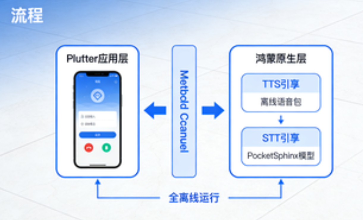 - 基于鸿蒙原生能力 + Flutter 跨平台特性,实现 TTS/STT 全离线运行(无网络环境下正常工作);