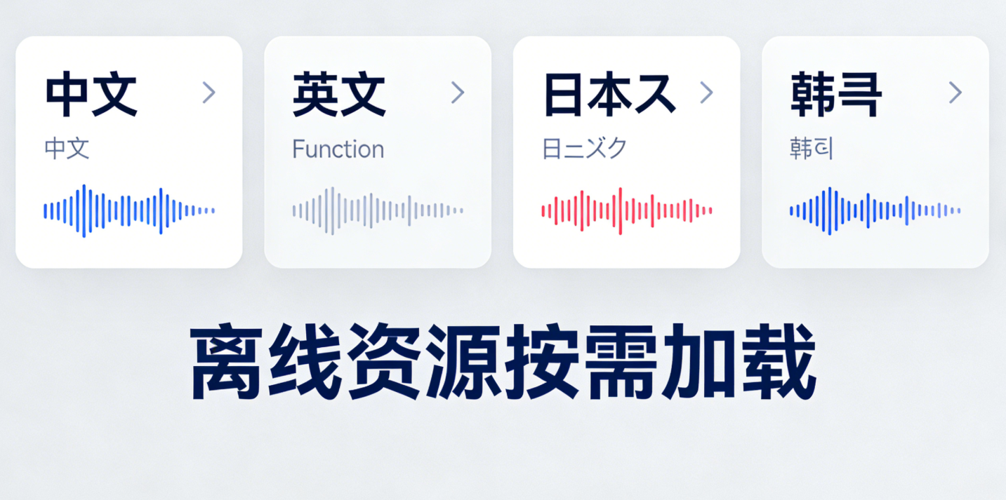工程内置常用语言(如中文、英文)的语音包 / 模型,减少初始安装包体积;