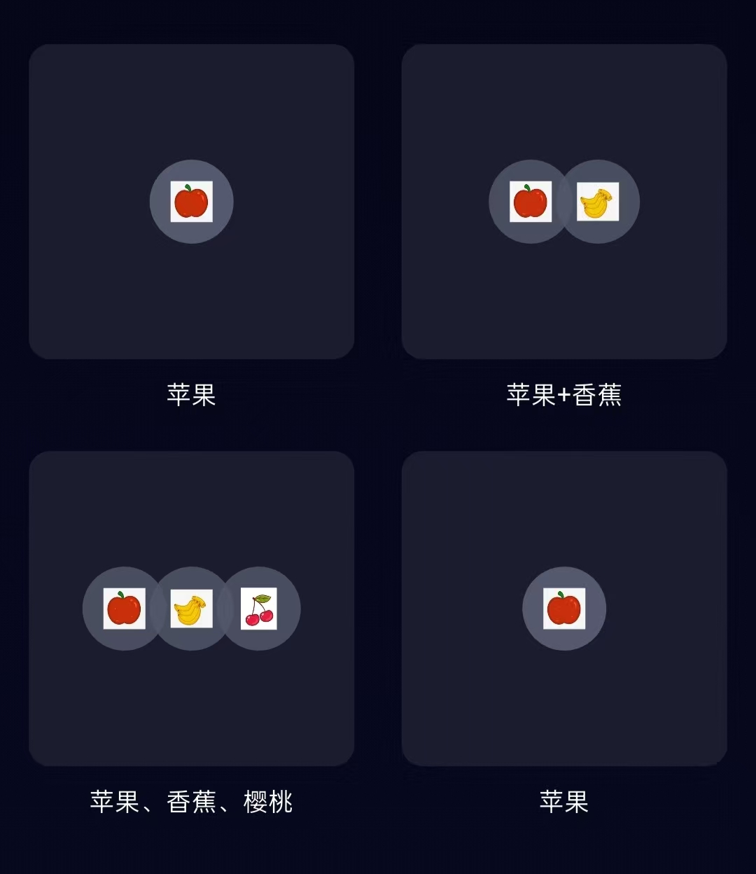 说明:版本1的中心水果图片只是简单的排列,这个版本是让图片进行两两交叠