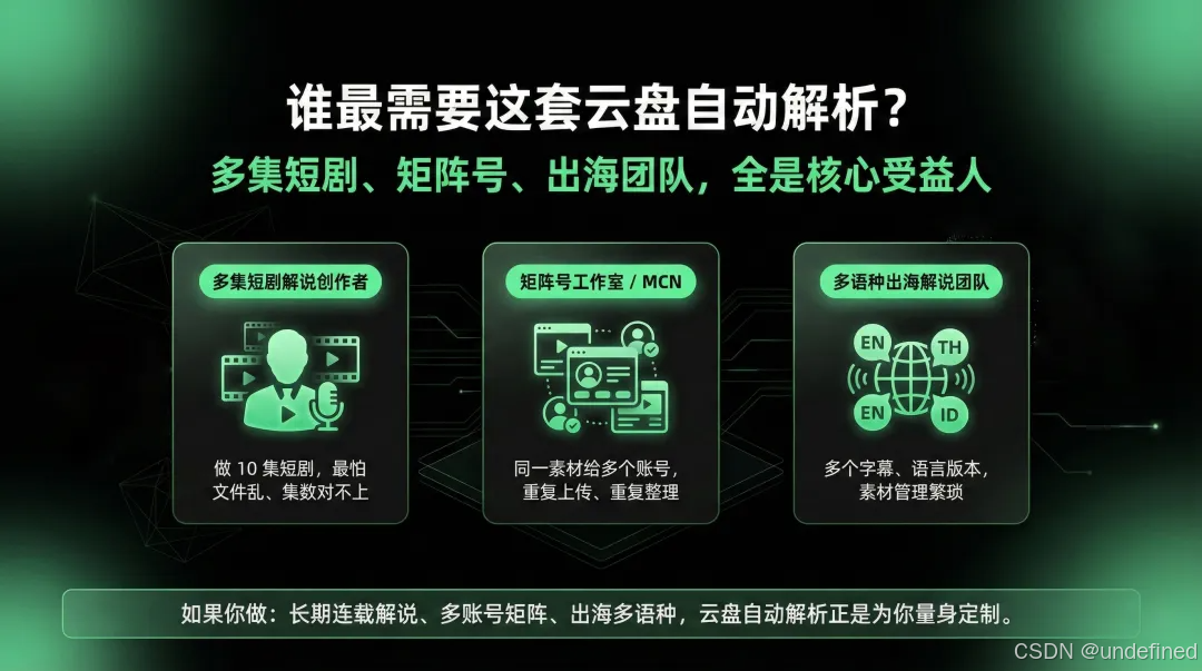 大批量短剧解说创作团队: 做系列、连载 解说,最怕文件乱、集数对不上,云盘能让你实现流水线式生产