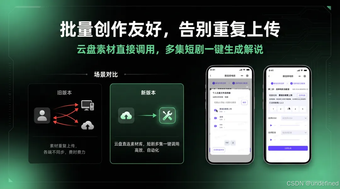 回顾一下你现在的操作流程:做100集短剧解说,你可能需要把这100集视频文件上传100次 。手机内存爆红,传输速度慢如蜗牛 ,不同设备 之间甚至没法同步进度。