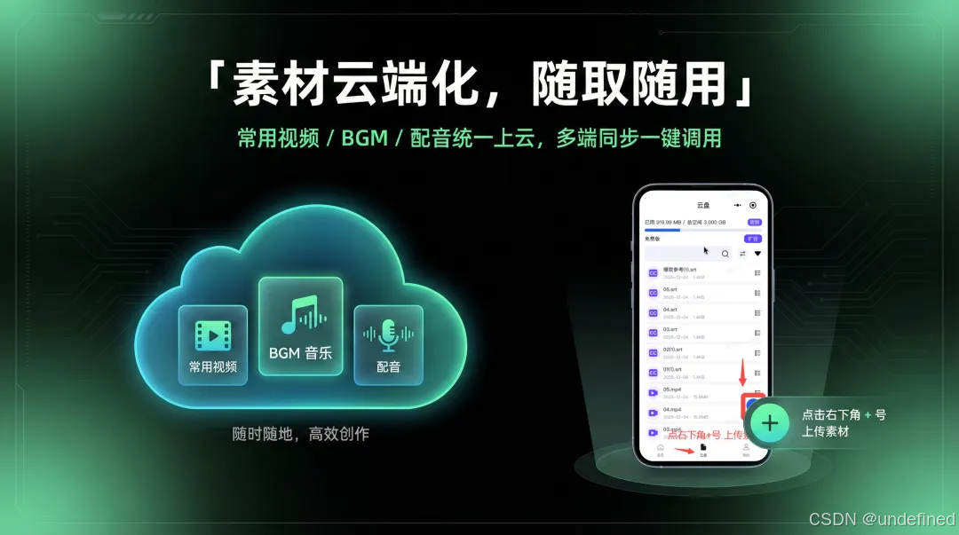 同时,我们还将这种云端化进一步延展:你常用的爆款背景音乐 、专属片头片尾 ,支持全部上传云端,无论换哪台设备登录,你的专属素材库都在手边。