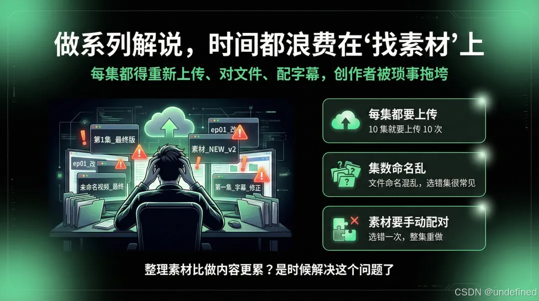 在短剧解说的生产链条里,真正拉低效率 ,是那些看似基础 却最消耗时间 的部分:素材准备与管理。当项目规模从单条视频扩展到几十集、上百集 时,素材管理 的复杂度会呈指数级增加。