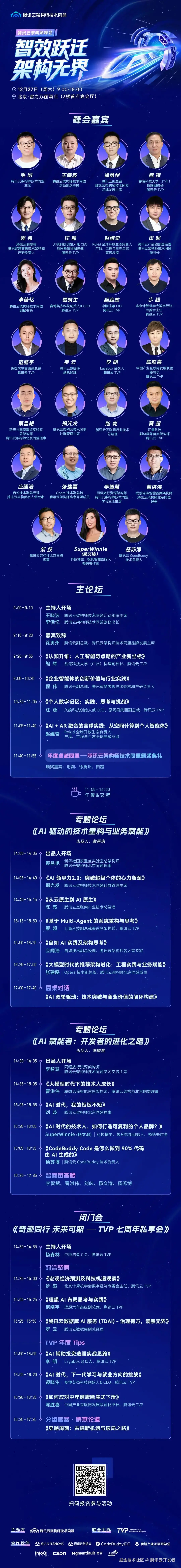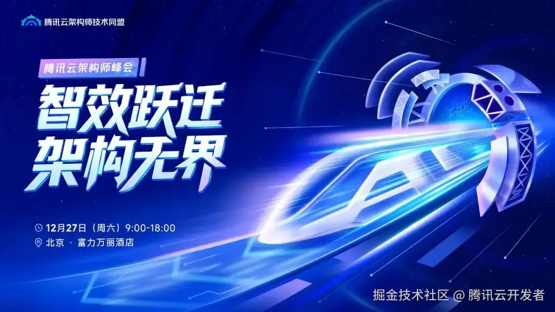 12 月 27 日,由腾讯云架构师技术同盟与腾讯云 TVP 联合主办的「智效跃迁,架构无界」腾讯云架构师峰会将在北京·富力万丽酒店盛大启幕。本次峰会致力于在岁末年初,为技术管理者与资深架构师校准 AI 时代的产业新坐标。