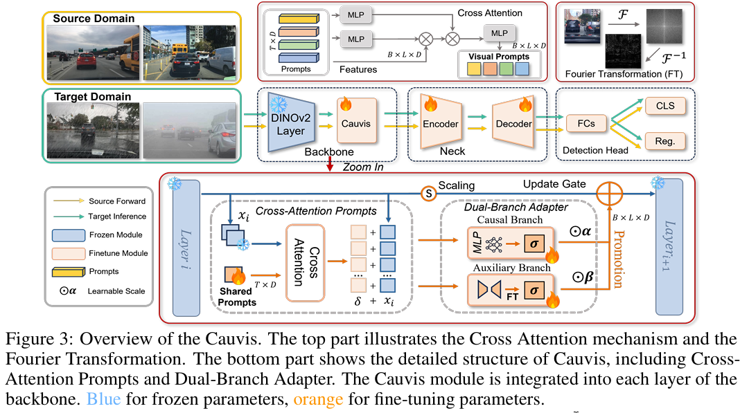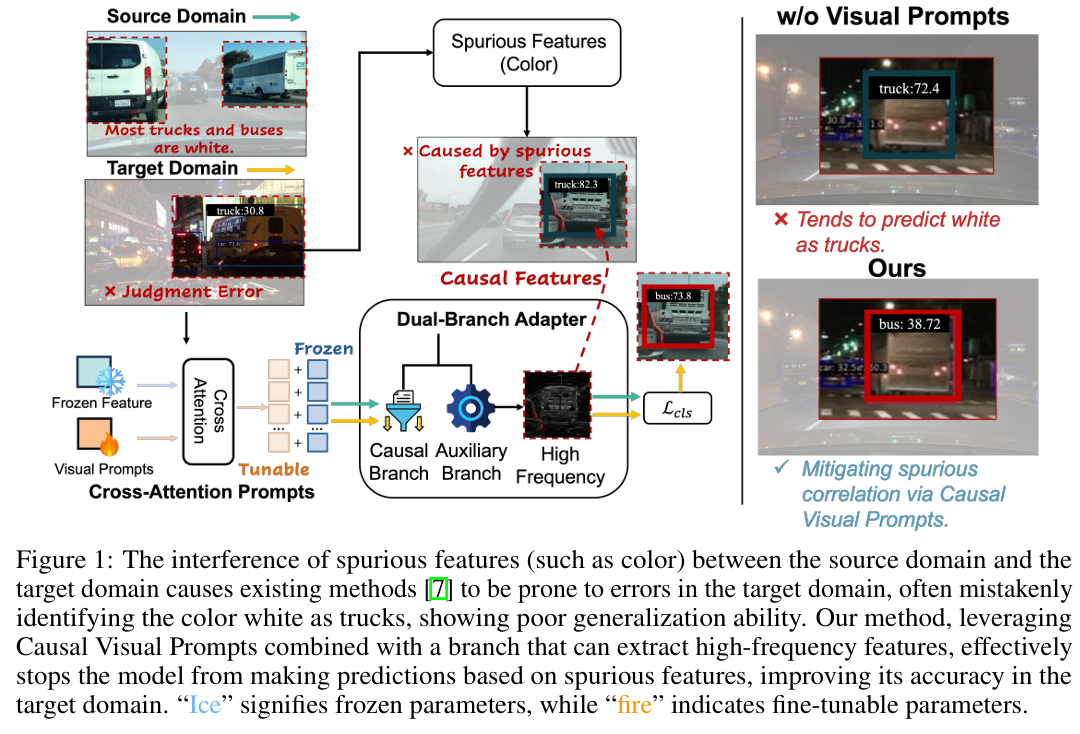 单源域泛化目标检测(SDGOD)作为计算机视觉领域的前沿研究课题,旨在通过单源域训练增强模型在未见目标域中的泛化能力。当前主流方法试图通过数据增强技术来减轻域差异。然而,由于域偏移和有限的域特定知识,模型往往陷入虚假相关性的陷阱。这表现为模型过度依赖简单的分类特征(如颜色),而非像物体轮廓这样的基本域不变表示。为应对这一关键挑战,我们提出了Cauvis(因果视觉提示)方法。首先,我们引入了交叉注意力提示模块,通过将视觉提示与交叉注意力相结合,减轻虚假特征的偏差。为了解决单域泛化中视觉提示的域知识覆盖不足和虚假特征纠缠问题,我们提出了一种双分支适配器,通过高频特征提取解耦因果-虚假特征,同时实现域适应。Cauvis在SDGOD数据集上实现了最先进的性能,比现有的域泛化方法提高了15.9-31.4%,同时在复杂干扰环境中表现出显著的鲁棒性优势。