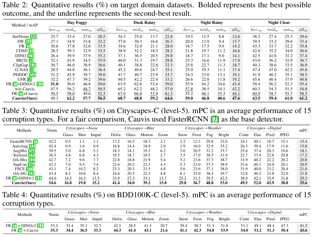 目标域上的结果。 表7总结了四个目标场景(白天雾天、黄昏雨天、夜晚雨天、夜晚晴朗)在三个类别划分(重型/中型/非机动车)和总体得分allmall_mallm上的结果。在所有配置中,Cauvis在几乎所有单元格中都达到最好或第二好的结果,并在每个场景中始终获得最高的allmall_mallm,优于强大的单域基线,如PDDOC[32]和UFR[6]。随着分布偏移加剧,优势变得更大:在恶劣天气下,Cauvis在白天雾天上超越UFR 16.9 mAP,在黄昏雨天上超越31.41 mAP(allmall_mallm),同时在所有条件下领先重型车辆划分。重要的是,增益不仅限于极端情况------Cauvis还改进了中型和非机动车划分------表明学习的表示是稳定和域不变的,而不是过度拟合严重腐败。消融实验("w/o Cauvis"和FR+DINOv2\mathrm{FR}+\mathrm{DINOv}2FR+DINOv2[11])进一步证实了这些发现:移除我们的组件会降低性能,而在FR+DINOv2\mathrm{FR}+\mathrm{DINOv2}FR+DINOv2[11]上添加Cauvis会产生额外增益,证实了交叉注意力提示(抑制虚假线索)和基于傅里叶的辅助分支(保留高频、域不变结构)的互补作用。源域上的结果可在附录B中找到。