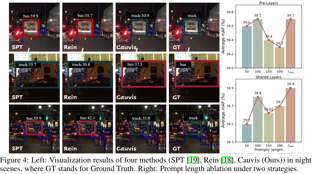 可视化结果。 如图4所示,我们在夜间场景中对Cauvis和现有PEFT方法进行了视觉比较。在以白色公交车为主导的驾驶场景中,参数高效微调(PEFT)方法(如SPT[19], Rein[18])在关键分类特征缺失时表现出虚假相关性偏差。一个尺寸类似卡车的白色公交车被所有比较方法误分类为"卡车"(图4,第1列)。这种视觉模糊促使比较模型依赖表面线索(如颜色)而非语义特征。我们的方法将分类权重从基于颜色的虚假相关性转移到结构判别器(如高频几何轮廓)。