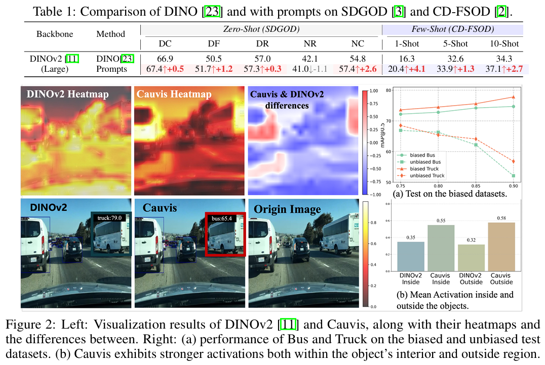 与SOTA方法比较。 在表7中,Cauvis在三个VFM上展示了对视觉提示方法(VPT[17], EVP[28], SPT[19])的一致优势,平均mAP改进分别为4.6%、4.0%和4.5%。Cauvis在所有三个VFM上保持对Rein[18]的明显优势,验证了其有效性。