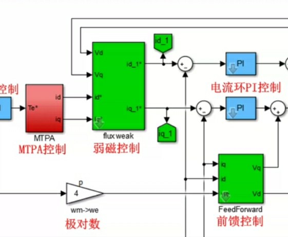 前馈弱磁控制主要通过对\(d\)轴电流进行控制,使电机的磁链减小,从而降低反电动势。在MATLAB/SIMULINK仿真中,我们可以这样搭建模型。