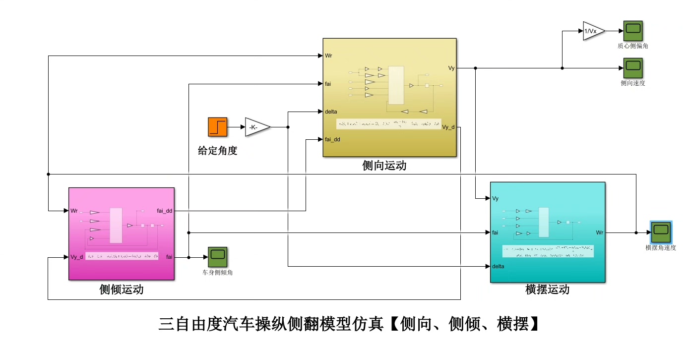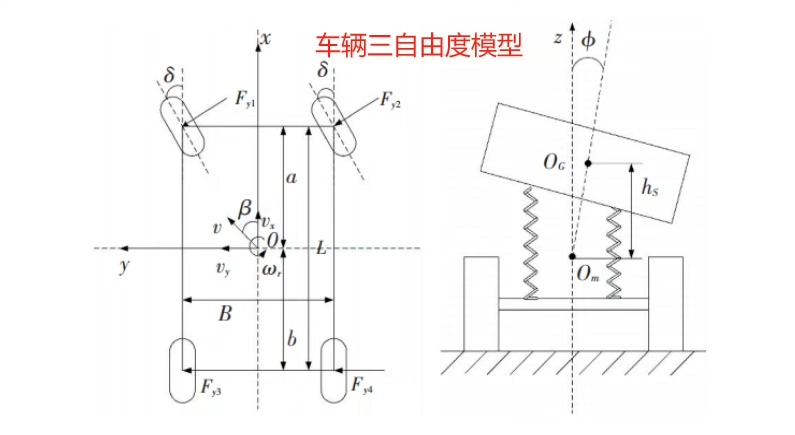 先看模型核心------把车拆解成三个方向的运动。二自由度模型大家都熟,横摆和侧向两个维度像在冰面上画八字。但真实开车时身体能感受到的左右倾斜,就藏在新增的第三个自由度里:侧倾运动。代码里用phi表示的这个角度,直接关系到车辆翻不翻车的关键时刻。