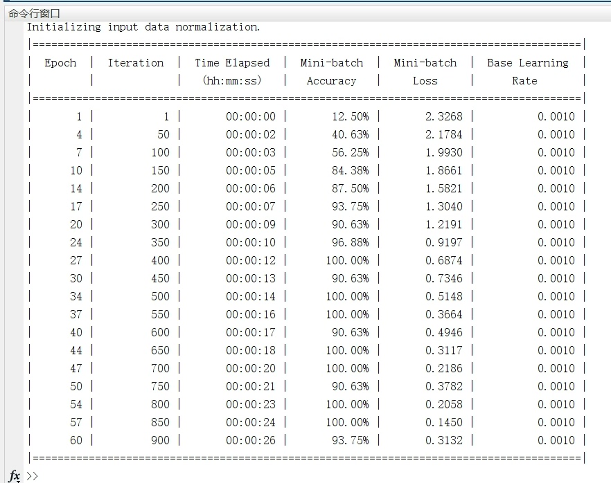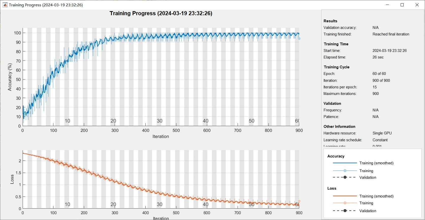这里使用 adam 优化器,设置最大训练轮数 MaxEpochs 为 50,初始学习率 InitialLearnRate 为 0.001。我们还指定了验证数据 validationdata**和验证标签 validation labels,每 10 轮进行一次验证。Verbose 设置为 false 不显示详细训练信息,同时开启训练进度图 Plots。通过 trainNetwork 函数进行模型训练。