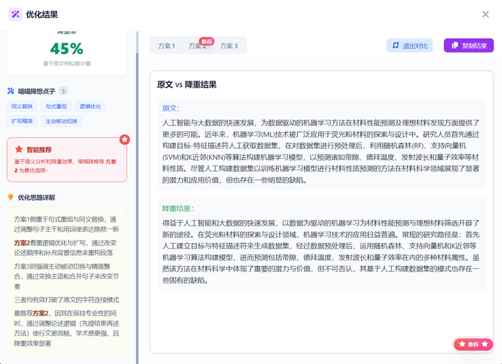 喵喵降还会基于语义分析,智能推荐一个最优方案,并说明理由------比如我看到它写"推荐方案2,因其在保持专业术语准确的同时,通过调整论述逻辑,使行文更流畅,学术感更强。喵喵降还会把这次降重所使用的方法都告诉我。比如同意替换、句式重组,逻辑优化,扩写精简,主动被动切换。看来他是真的想教会我降重啊。有点东西啊,真给我看学会了"