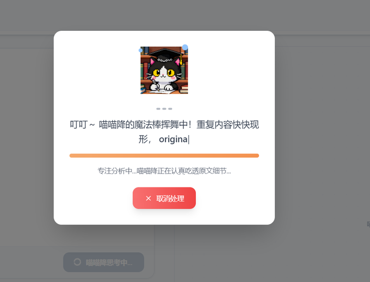 后来是一个已经毕业的博士师兄悄悄推给我一个工具,叫喵喵降。他说:"你别自己硬改了,让AI帮你'学术化改写',保住逻辑的同时把字面重复率打下去。"