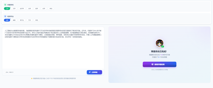 我是工科的,导师给我选了个听起来牛逼的机器学习方向,我之前都不知道是什么,到真写论文的时候,我是啥也不会。我就想了一个快速生成论文初稿的法子。反正我就先把初稿抄完,也不管抄谁的,先抄完之后再慢慢降重。降完了不就等于是我写的了吗?所以我就直接去知网乱翻相关的论文,抄别人的话术,东抄抄西抄抄,好不容易拼凑出一篇像样的文章,但因为都是直接抄的,重复率想都不用想肯定高,然后我直接拿喵喵降开始干活。比如我把我初稿中的一段关于"机器学习在材料预测中的应用"的原文粘贴进去,选好学科工科和我的查重平台(知网),然后直接点击开始降重,就看见喵喵降在呼哧呼哧的给我干活了,还真有点意思。