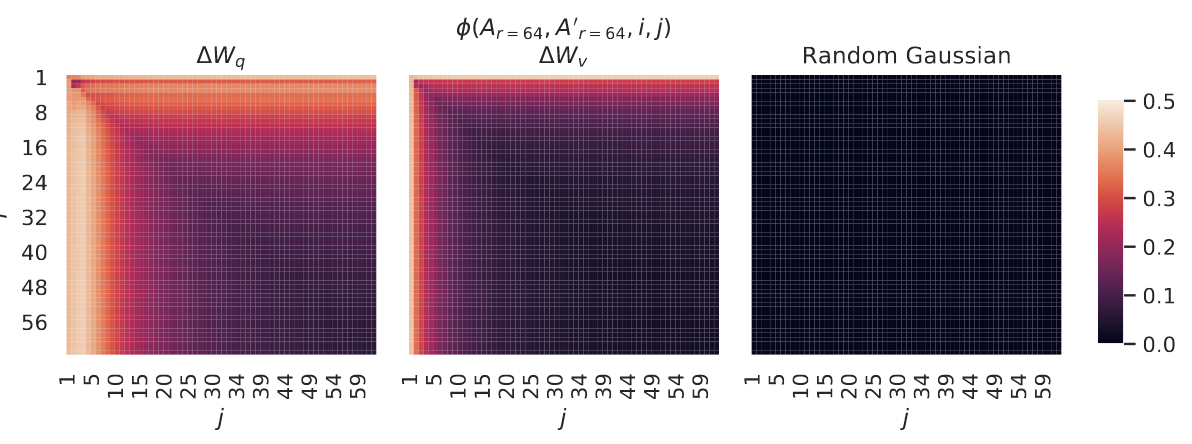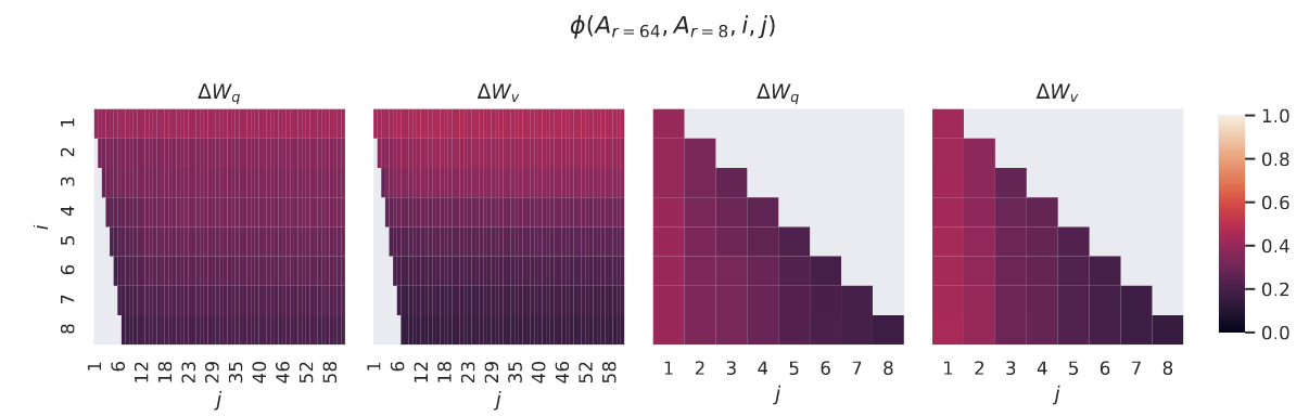 其中 U A r = 8 i U_{A_{r=8}}^i UAr=8i 表示 U A r = 8 U_{A_{r=8}} UAr=8 中对应于前 i i i 个奇异向量的列。 ϕ ( ⋅ ) \phi(\cdot) ϕ(⋅) 的取值范围为 [ 0 , 1 ] [0, 1] [0,1],其中 1 表示子空间完全重叠,0 表示完全分离。关于 ϕ \phi ϕ 随 i i i 和 j j j 变化的情况,请参见图 3。由于篇幅限制,论文仅考察第 48 层(共 96 层),但正如 H.1 节所示,该结论对其他层同样成立。